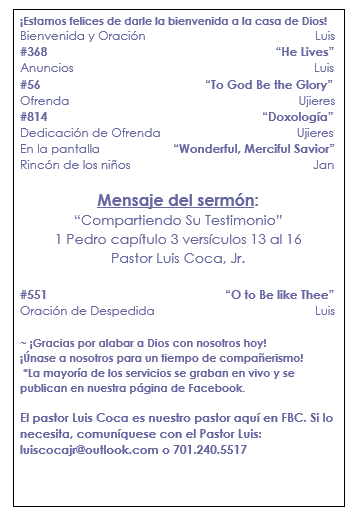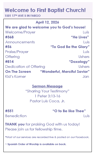 Link to Facebook page. Live video most Sunday mornings at 10:45 am